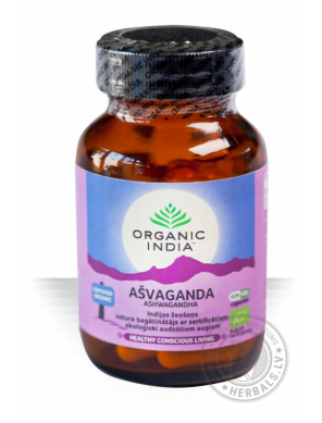 ASHWAGANDHA ORGANIC herbals Ašvagandha pastiprina organisma spēju saglabāt fizisko aktivitāti un palīdz novērst stresu, nogurumu un bezmiegu. Tonizē, atjaunina, nostiprina nervus.
