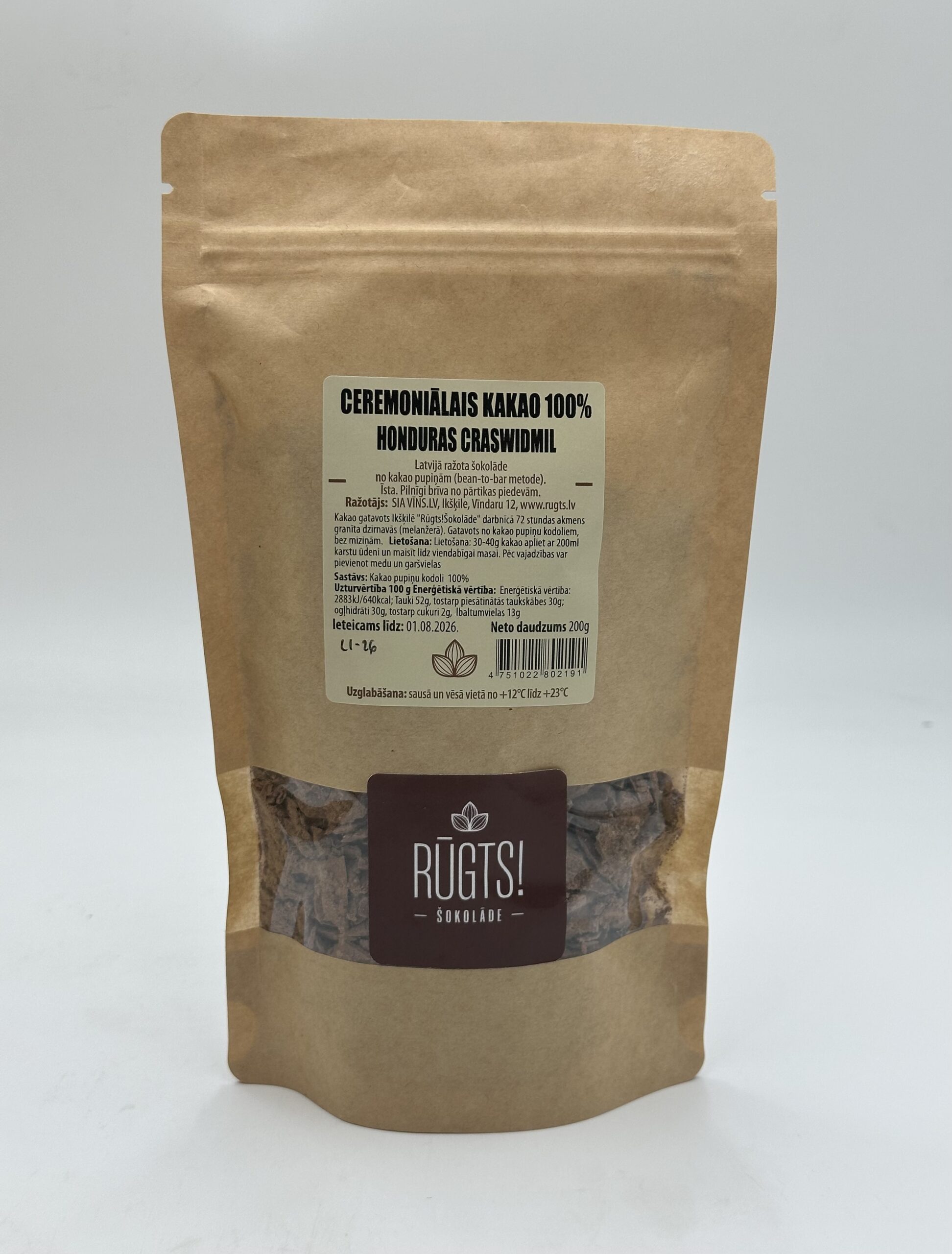 No kakao pupiņām (bean-to-bar metode).Īsta.Pilnīgi brīva no pārtikas piedevām.Kakao gatavots Ikšķilē “Rūgts! Šokolāde” darbnīcā 72 stundas akmens granīta dzirnavās (melanžerā). Gatavots no kakao pupiņu kodoliem, bez miziņām.Lietošana: Lietošana: 30-40g kakao apliet ar 200ml karstu ūdeni un maisīt līdz viendabīgai masai. Pēc vajadzības var pievienot medu un garšvielas.Sastāvs: Kakao pupiņu kodoli 100%Uzturvērtība 100g Enerģētiskā vērtība: Enerģētiskā vērtība: 2883kJ/640kcal; tauki 52g, tostarp piesātinātās taukskābes 30g; ogļhidrāti 30g, tostarp cukuri 2g, olbaltumvielas 13g.