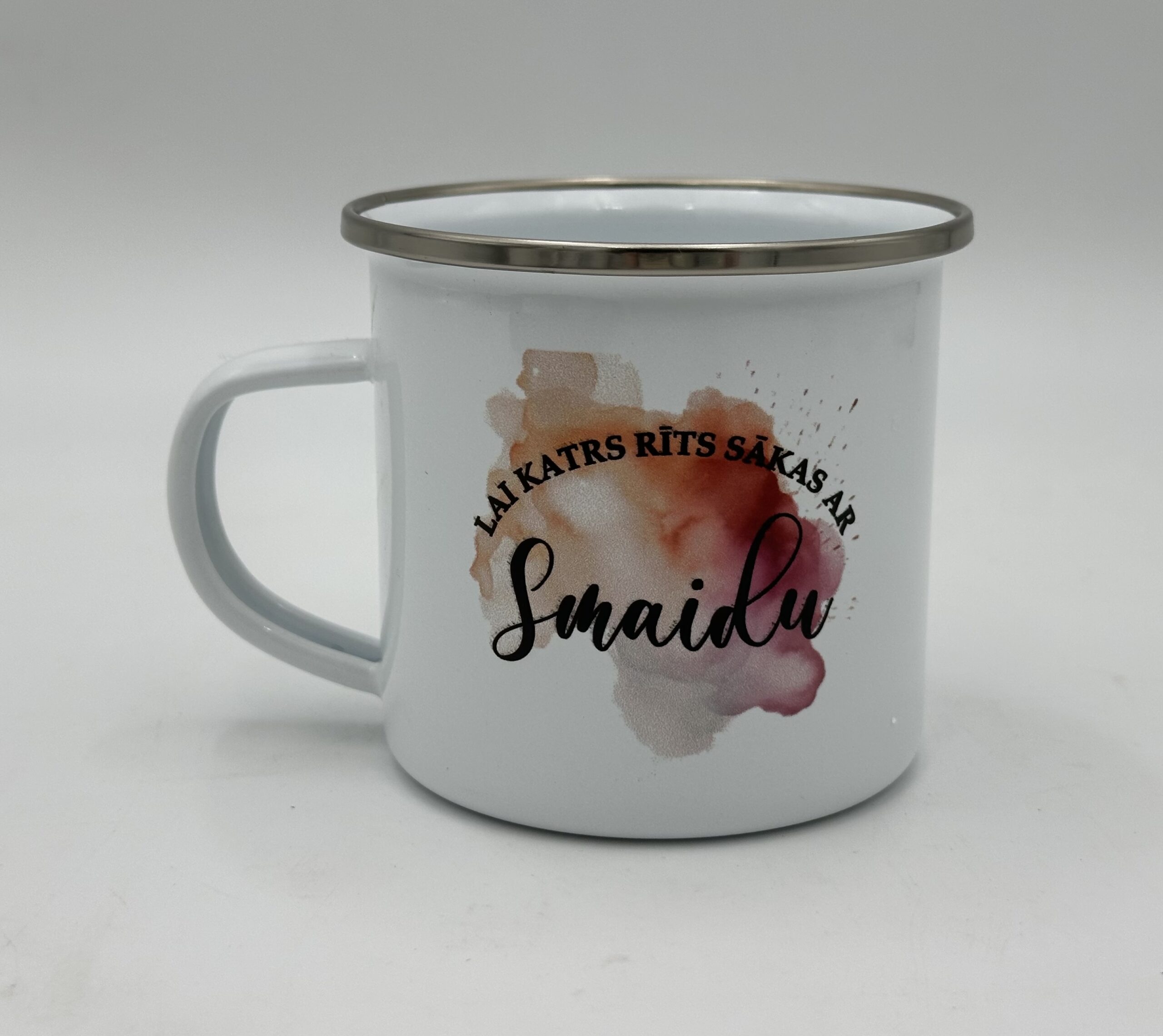 VaiDer Metāla krūze ar apdruku Lai katrs rīts sākas ar smaidu!